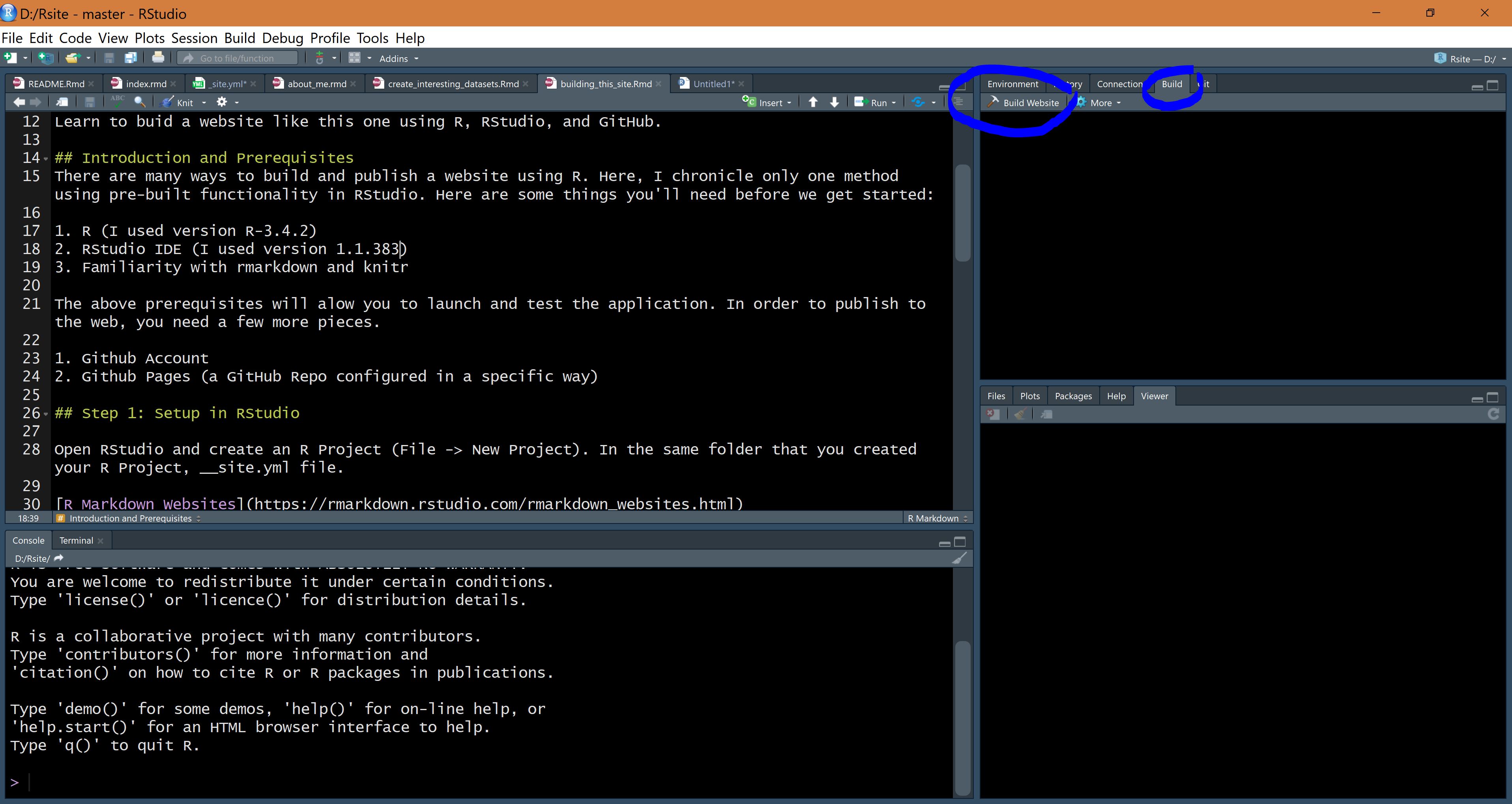 There are many ways to build and publish a website using R. Here, I chronicle only one method using pre-built functionality in RStudio. Here are some things you’ll need before we get started: